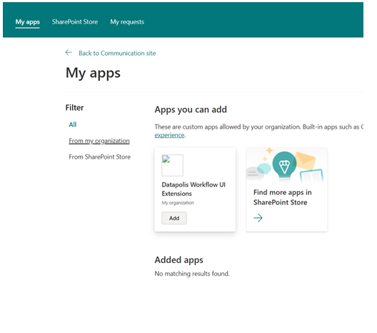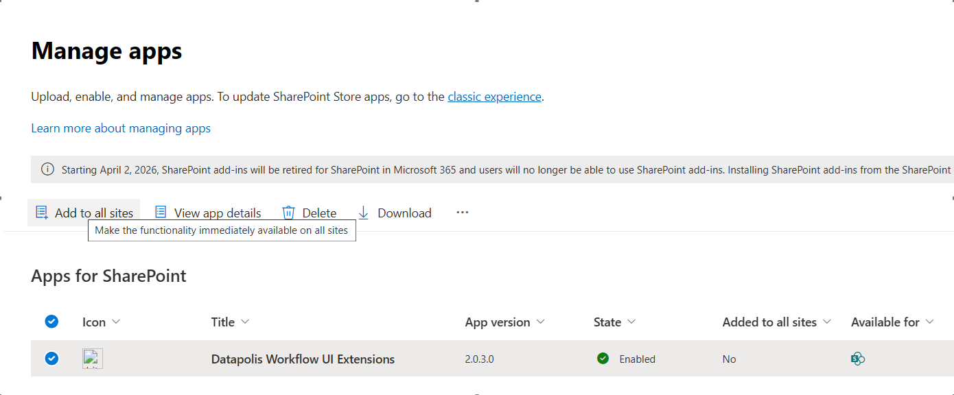 If you selected the option "Enable this app and add it to all sites" for app availability, UI extension icons will be automatically added to each list. We recommend this option. However, if you choose the "Only enable this app" option, you will need to manually add the app to make the Datapolis Workbox icon visible. If you wish to apply UI Extensions to all sites after initial deployment, please navigate to your tenant app catalog: https://{YOUR_TENANT}-admin.sharepoint.com/_layouts/15/tenantAppCatalog.aspx Select Datapolis Workflow UI Extensions and click Add to all sites: