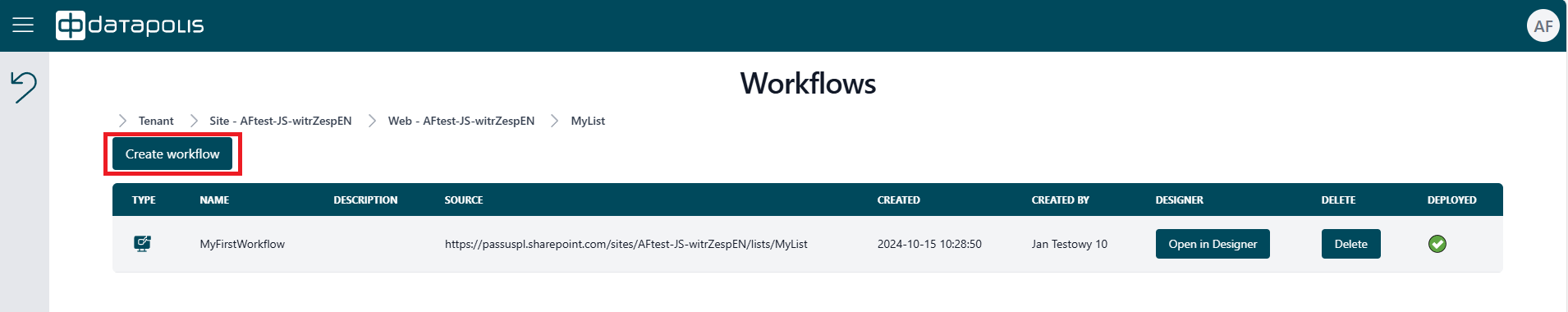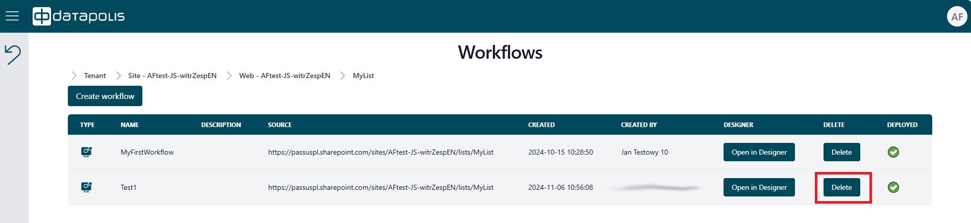 To remove a workflow from the Datapolis Portal, click the Delete button marked by the red frame in the screenshot below.