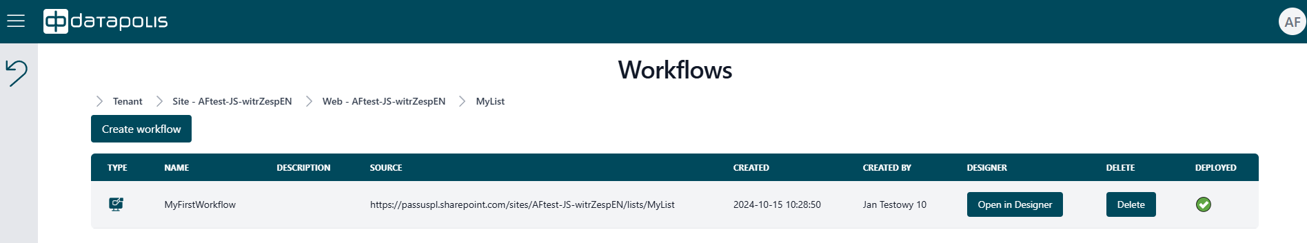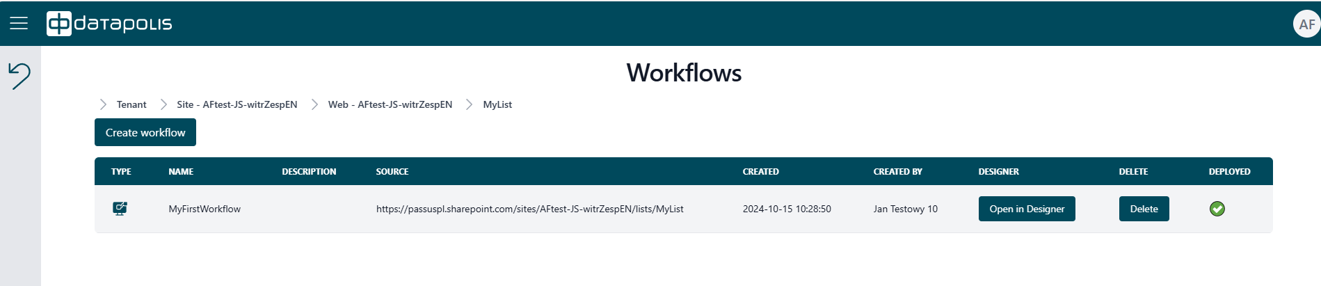Through the Datapolis Portal, you can access the Designer, where workflows can be created and configured. Simply click the Open in Designer button corresponding to the specific workflow.