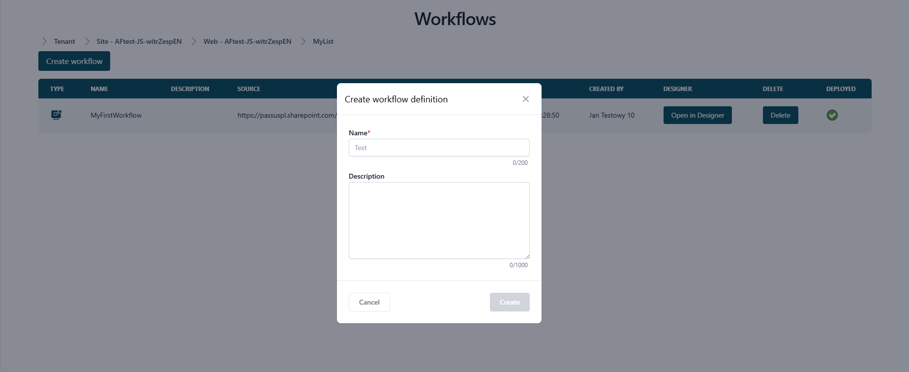Then a window will appear in which you need to fill in the name field and click the Create button. You can also complete the Description field by providing a few sentences characterizing the created workflow.