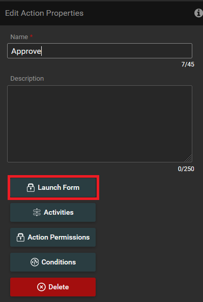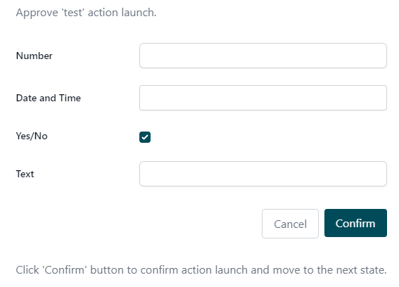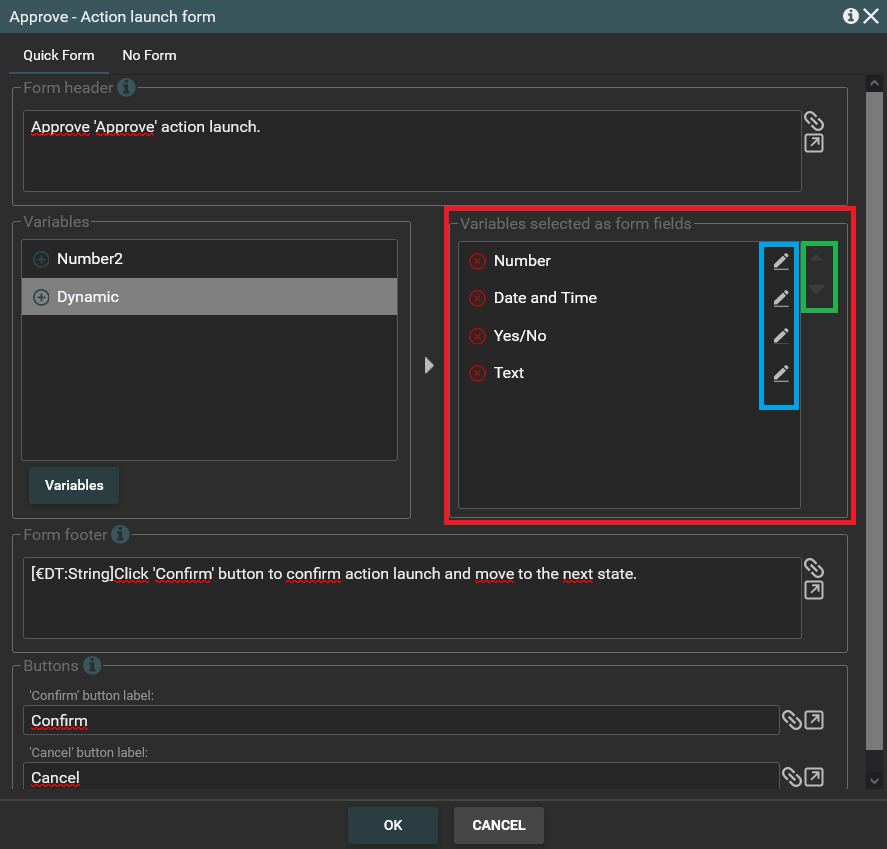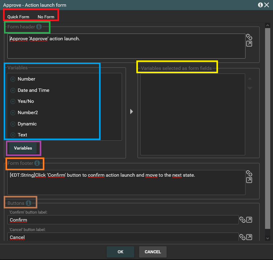 - You can change the text of 'Confirm' and 'Cancel' button for the Action Launch Form - the field marked with a brown frame.