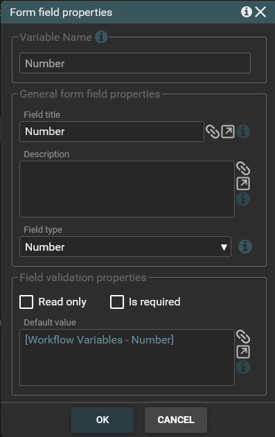 Note: It is important to understand the difference between workflow variables and form fields. Workflow variable is an abstract object where data is stored and from where it can be retrieved and used within the workflow.