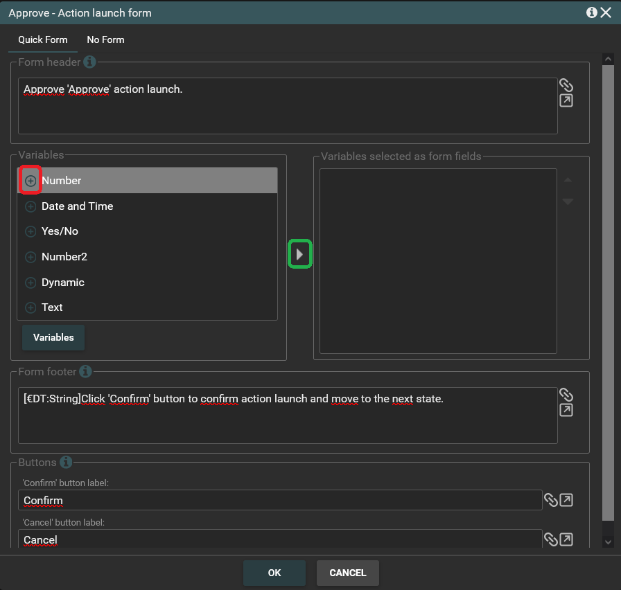 When you assign variables to the form you can click OK. The window will close. You can also stay in the window to make further settings. Do not forget to click OK after setting the Action Launch Form properties.