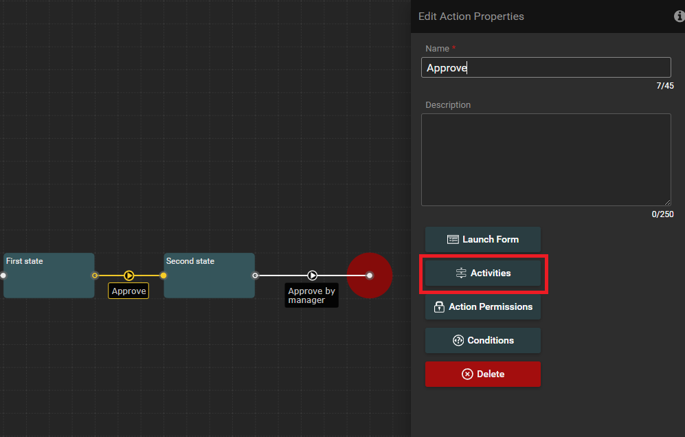 You can also double left click on the action, which will open the 'Edit action properties' window. Then press 'Activities'.