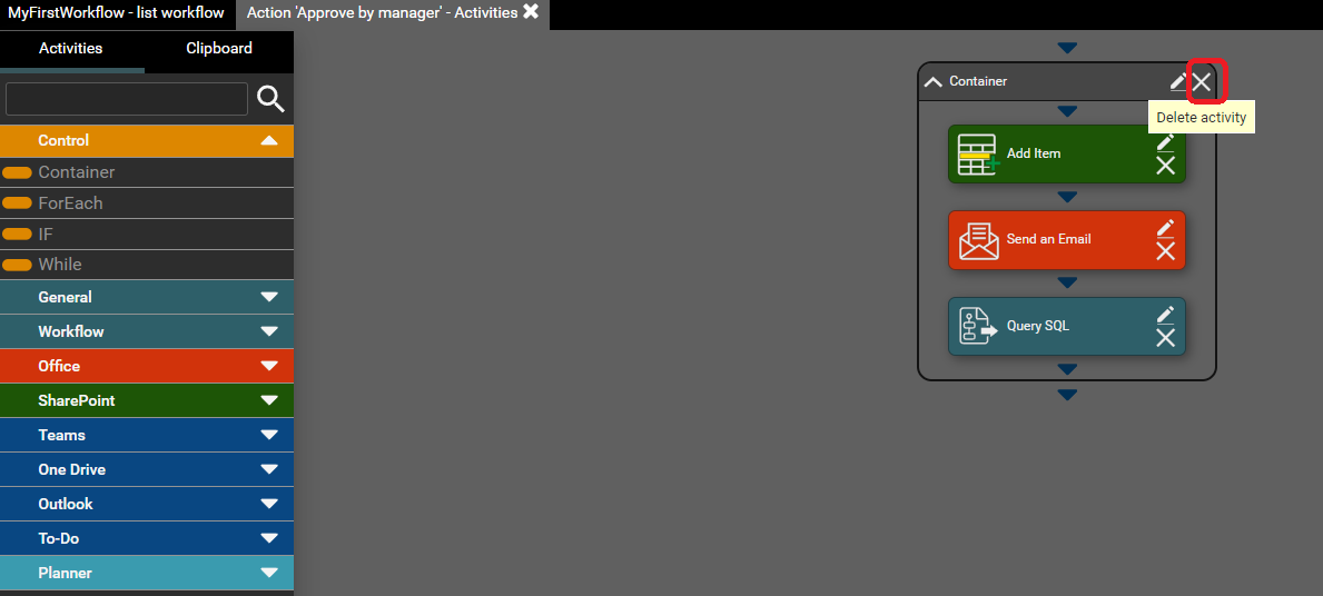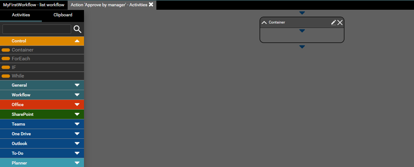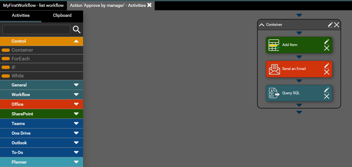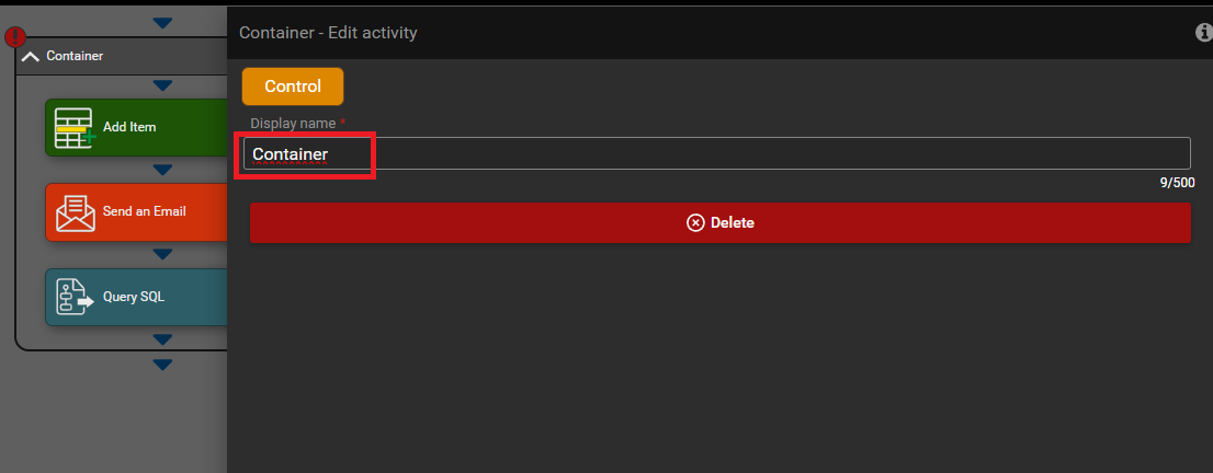 Container is used to organize activities. Allows you to organize workflow activities in a named group. You can insert activities into the container as shown in the second screen-shot below.