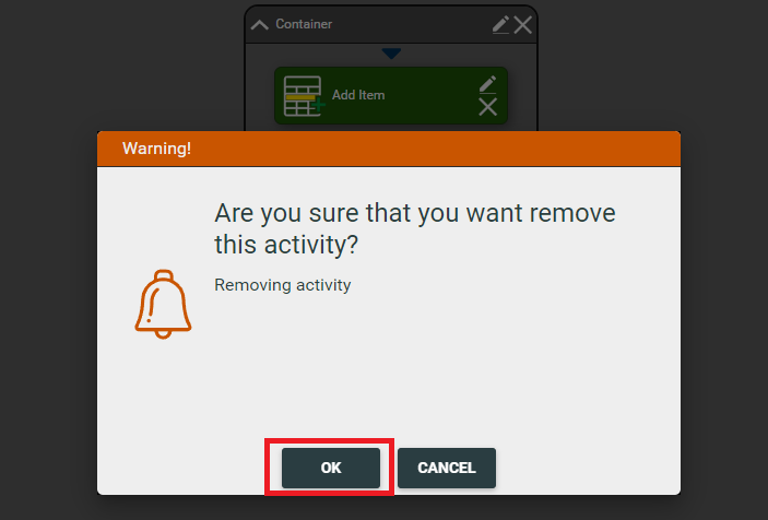 When you want to remove container from the action, you should press the left mouse button on the cross icon next to the container you want to remove, and then in the modal window confirm the action to remove the container. After pressing OK, the container will be removed.