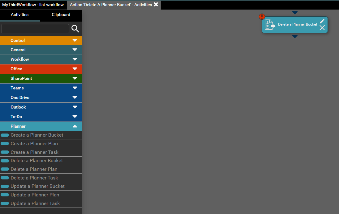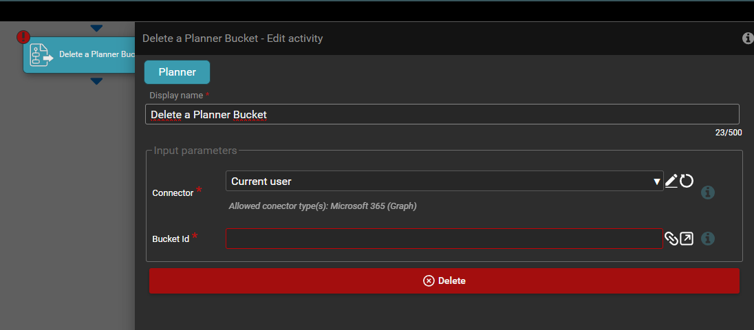 Activity allows to delete a Planner Bucket in Microsoft Planner application.
