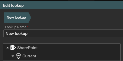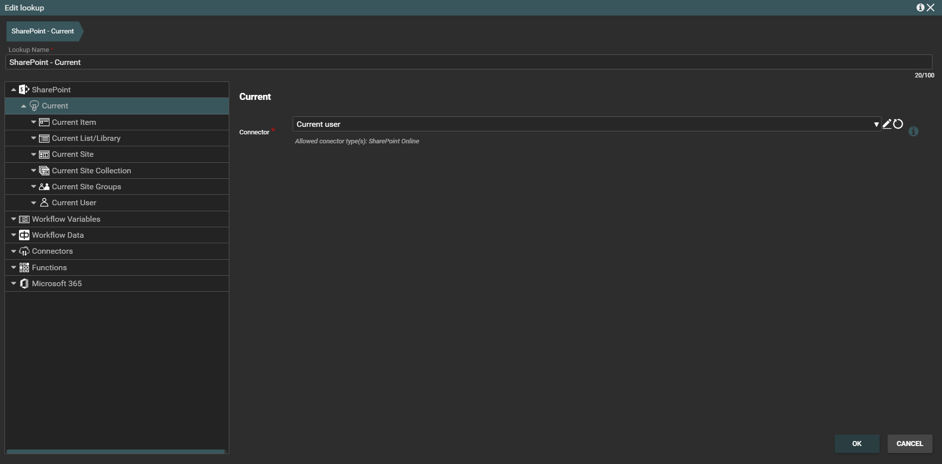 The SharePoint group contains lookups for everything on Sharepoint that is lookups for the Current Item, Current List/library, Current Site, Current Site Collection, Current Site Groups, Current User.