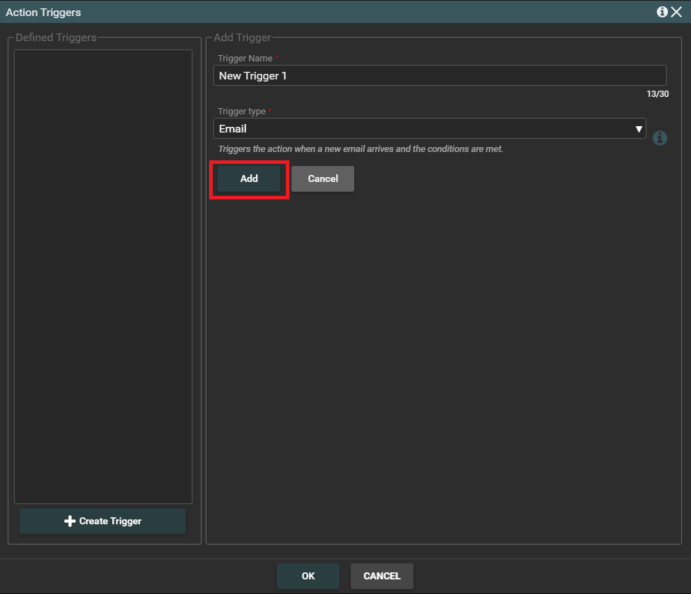 When you click the Add button labeled on the screen above, the next fields to be completed will be displayed. When setting up the trigger, a selection of connectors and variables is required.
