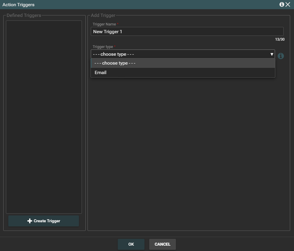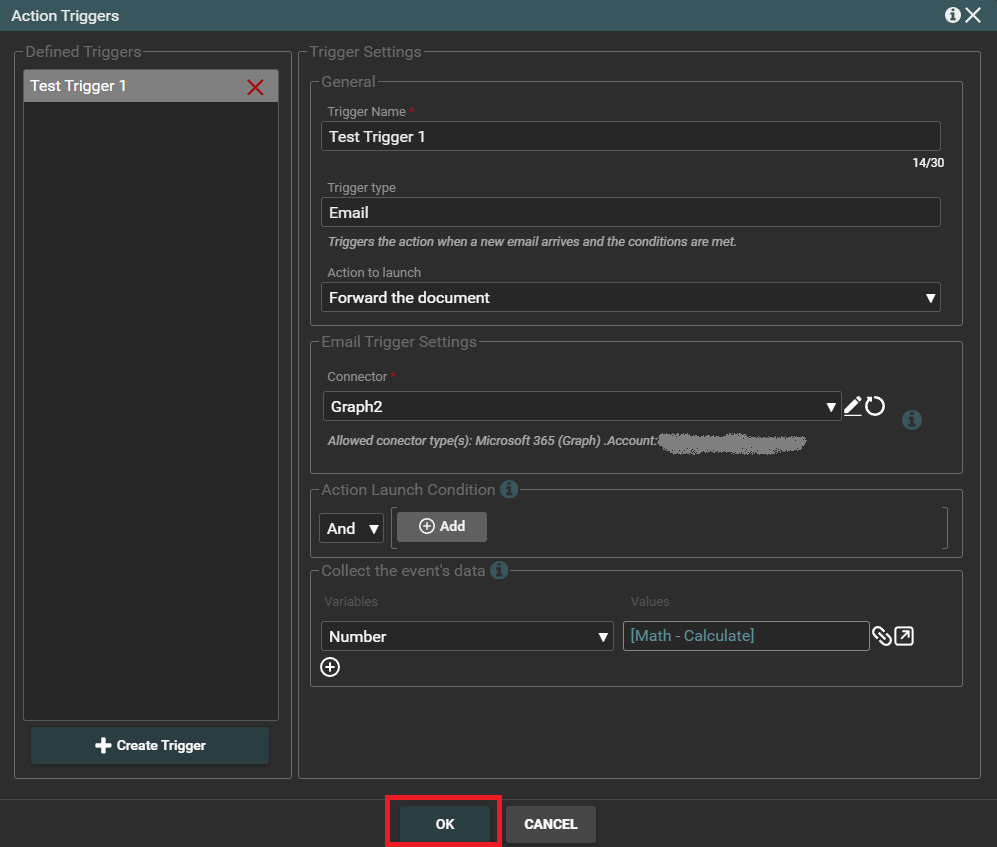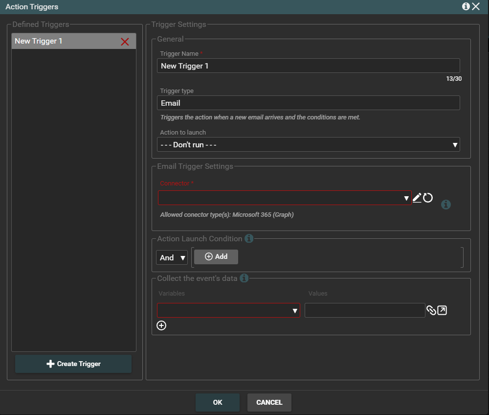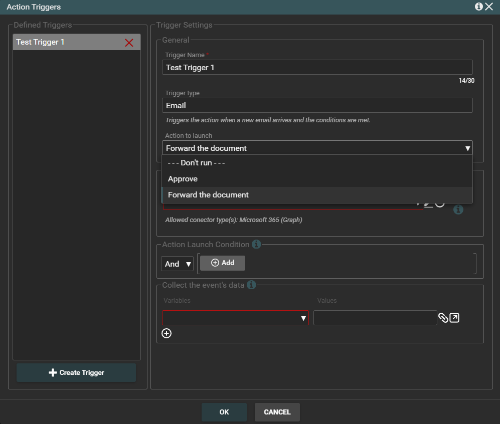 Then set the connector, only Graph type connectors are available. In addition, you should also select a variable and a value for it. To confirm the trigger settings you need to press the OK button.