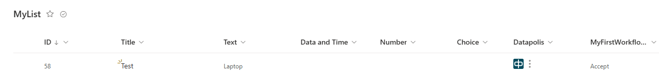 After deploying the workflow in the designer, return to the SharePoint list. We add a new item by entering the value Test in the Title column field and value Laptop in the Text column field.