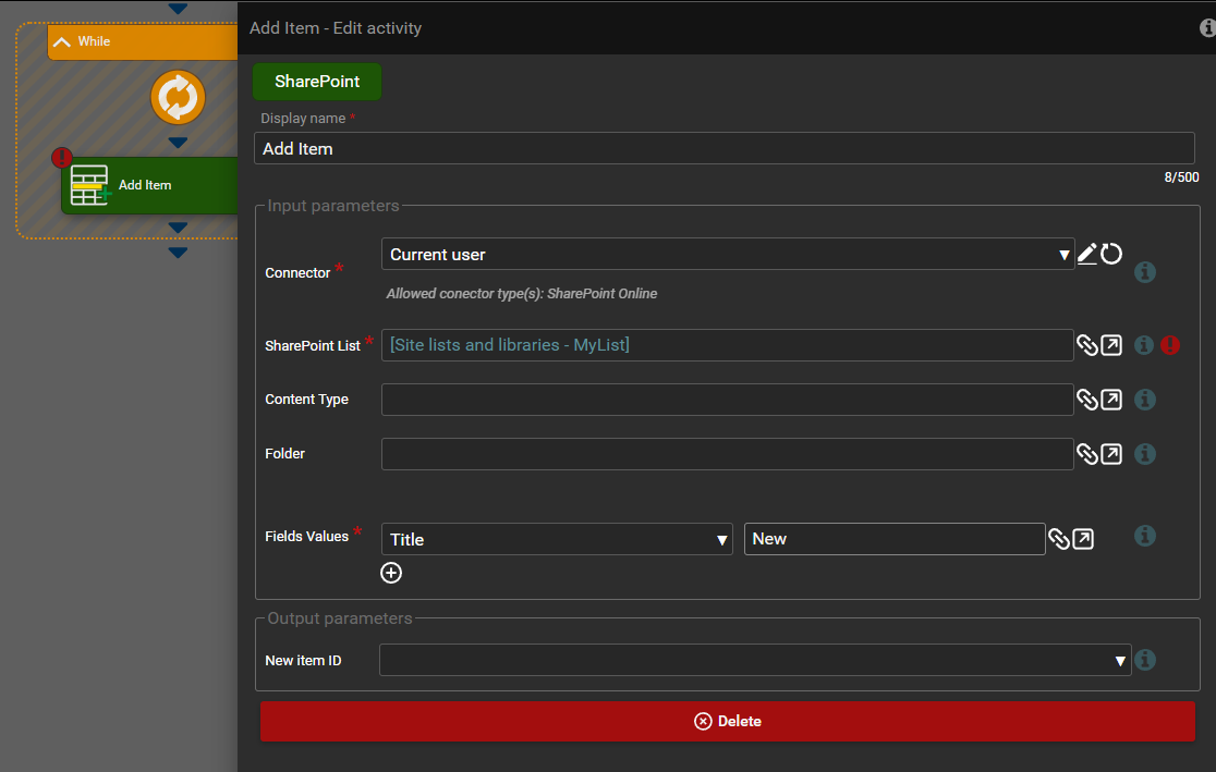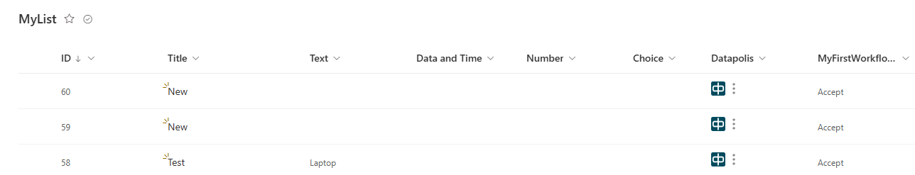 We trigger the action with the While activity. After running it, we can see that the conditions were met. The Add item activity set in While was executed twice, meaning two items were added to the list with the value "New" in the Title column fields, as specified in the While activity parameters.
