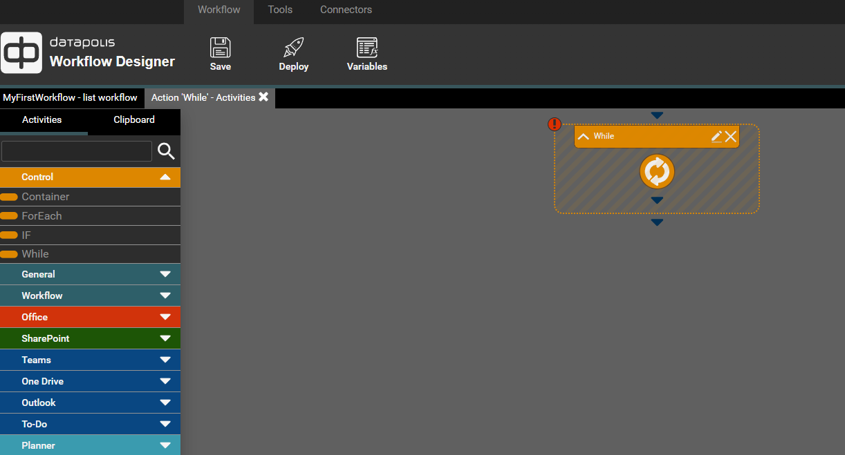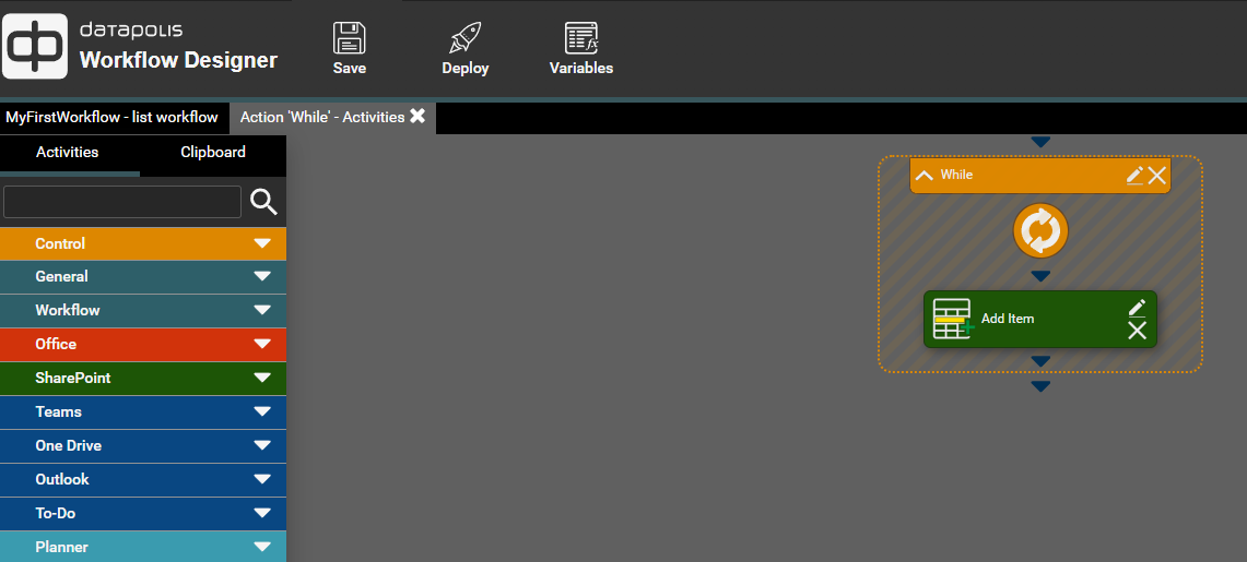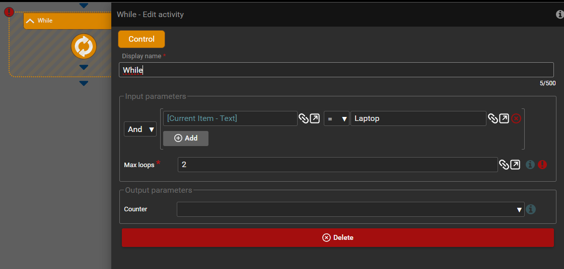 Let's make a simple example of a While activity. First, click the pencil icon to assign appropriate parameters of the activity.