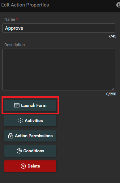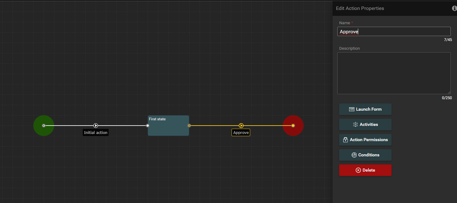 You can assign a form to an action. To create a form for an action, hover the mouse cursor over the selected action in designer, then double-click with the left mouse button. The edit action properties screen will appear from the right side of the screen.