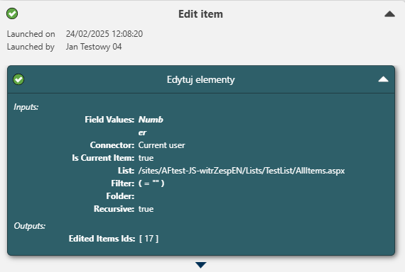 Aside from a brief view of all action and states which the workflow went through, you can also see the details of any action: what activities were launched and with what parameters, check if there were errors or warnings, what values they returned. You can also view what values were provided in action launch forms. This information allows you to monitor the process and helps detect errors during workflow development.