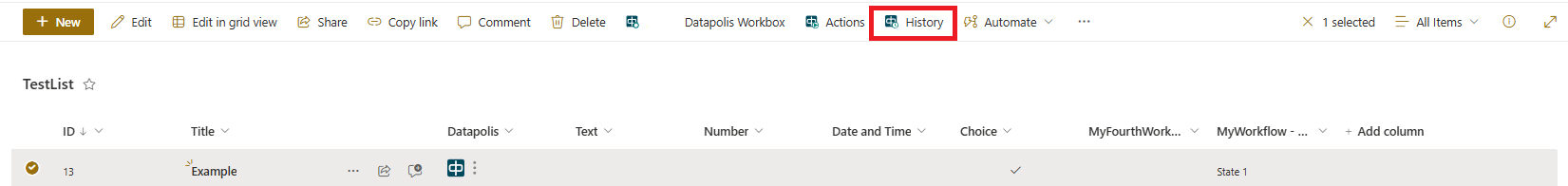 To see the workflow history preview you should select and check the list item on which you want to see the history. Then the History icon will be displayed in the menu at the top. After that you should to the History icon click. (The icon is marked with a red frame on the screen-shot below.) If only one workflow was running on the item, the history page will open immediately. However, if more than one was running, a menu with a list of workflows will be displayed on the right side.