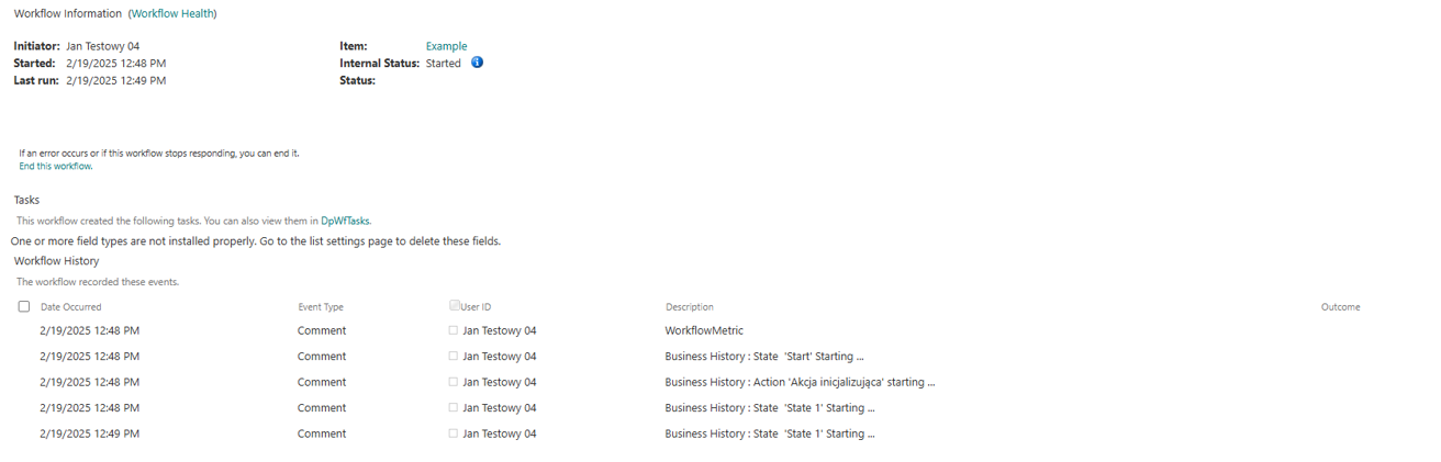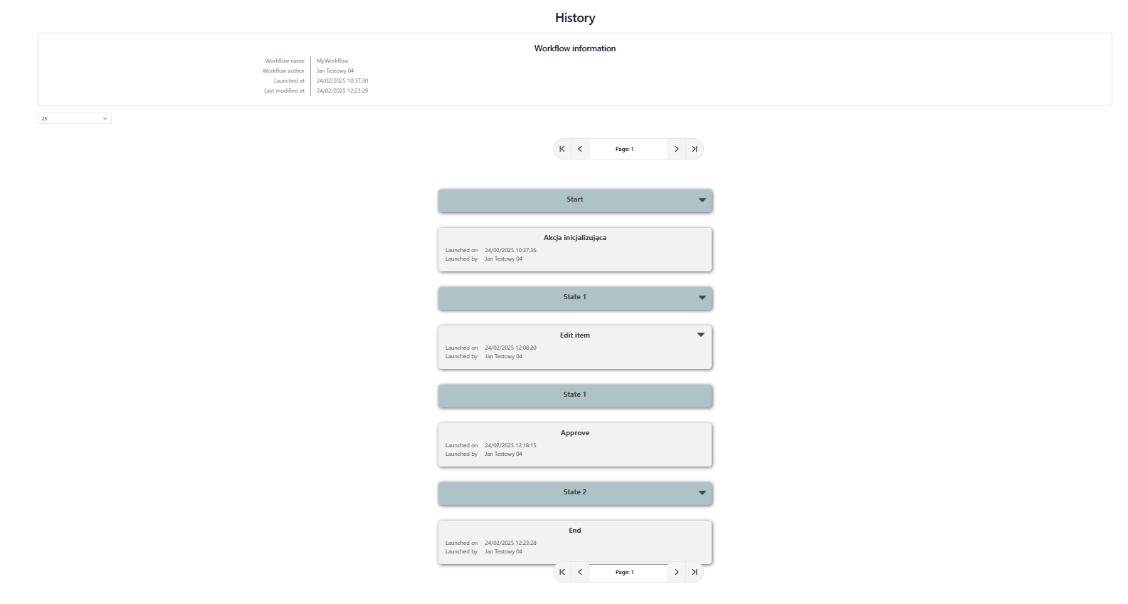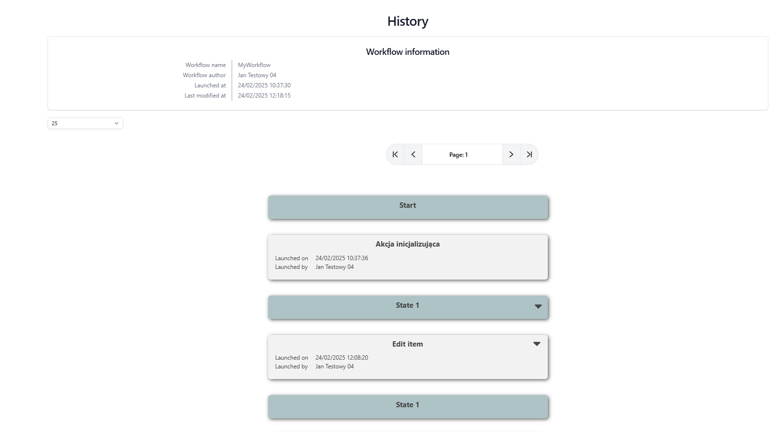 In any moment when workflow is running (and when it has ended) we can check its history. Here we will find various information about the process, how it worked, who launched which action, in which state the workflow waited most time, etc.