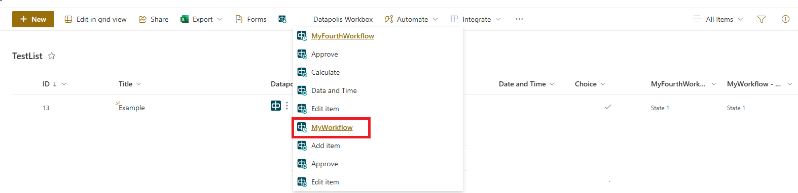 Also you can see a history of the workflow in another way. On a selected item you have to click on the dots. A menu with the name of workflow and available actions will be displayed. You have to click the name of workflow. It is shown below. A page with a workflow history preview will open.