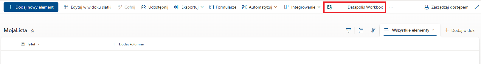 Administracja przepływami jest niezbędna do tworzenia przepływów. Po zainstalowaniu Datapolis Workbox na witrynie SharePoint widoczna jest ikona Datapolis Workbox. Jest ona widoczna w czerwonej ramce na poniższym zrzucie ekranu.