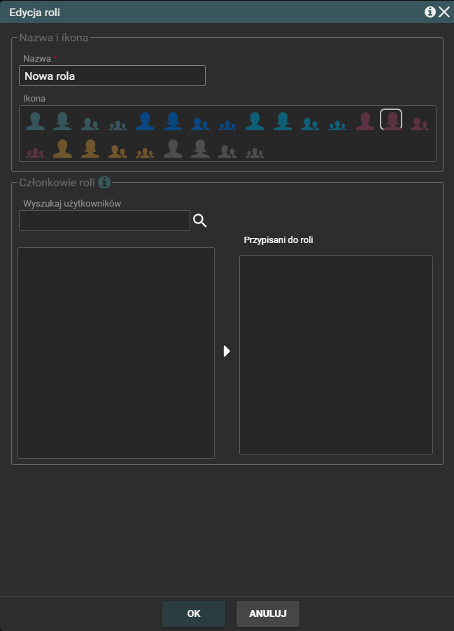 W oknie definiowania roli można ustawić jej nazwę, wybrać wygodną ikonę i przypisać użytkowników lub grupy SharePoint. Aby zapisać nową rolę, należy kliknąć przycisk OK.