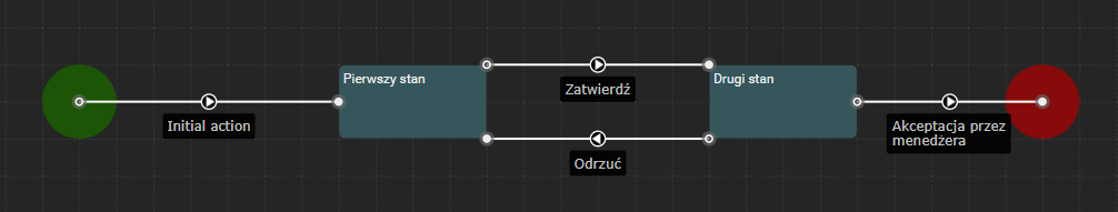 Kiedy proces znajduje się w stanie „Pierwszy stan”, użytkownik może uruchomić akcję „Zatwierdź” lub „Odrzuć”.