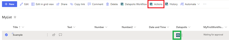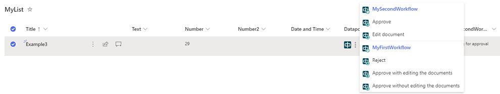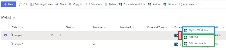 - An additional way to start an action is to click on dots next to the Datapolis icon on the selected item. A menu with the name of workflow and available actions will be displayed. On the screen-shot below: