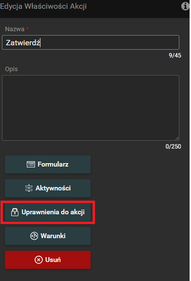 - Uprawnienia do akcji - umożliwia edycję uprawnień do akcji