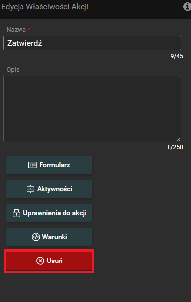 Należy dwukrotnie kliknąć na akcję. Otworzy się okno edycji właściwości akcji. Następnie należy kliknąć przycisk usuwania. Następnie otworzy się okno modalne potwierdzające usunięcie akcji. Aby zakończyć operację, kliknij przycisk OK.