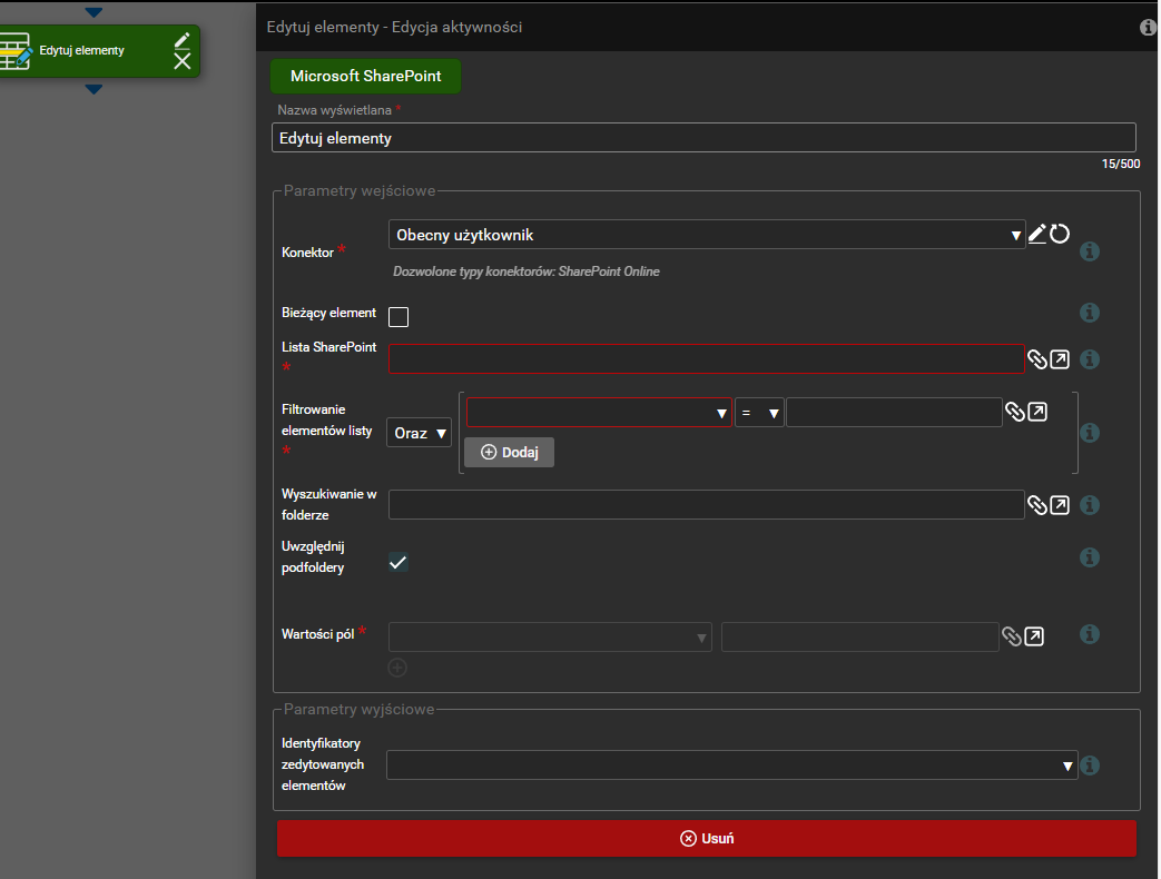 - Edytuj elementy - aktywność pozwala edytować wybrane elmenty na liście SharePoint.