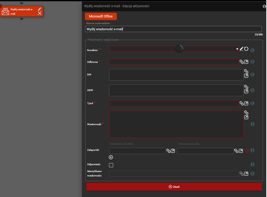 - Wyślij wiadomość e-mail - aktywność pozwala na wysłanie wiadomości e-mail.