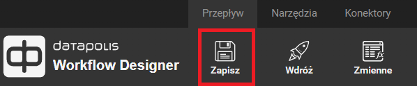 Aby zapisać definicję przepływu pracy, należy kliknąć ikonę Zapisz na wstążce. Spowoduje to zapisanie wersji roboczej.