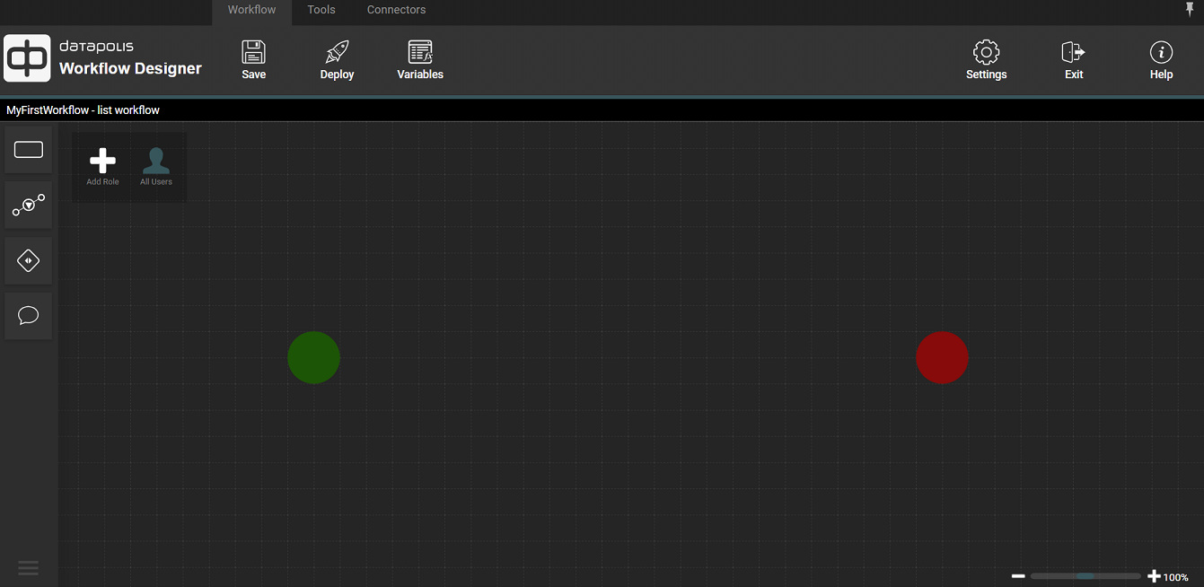 After filling in the fields you will be redirected to the designer, where the Workflow is shaped. The designer looks like this: