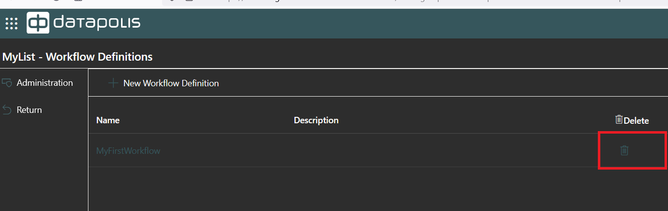 If you want to remove a workflow you have to click Trash Can icon. The icon is marked on the screen with a red frame. After clicking, a modal window will appear in which you have to confirm the delete action. When you click OK the workflow will be deleted.