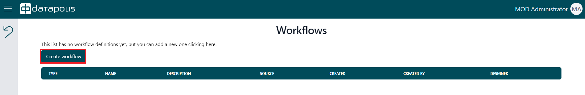 At first you have to click on Datapolis Workbox shown above. There will emerge a page where you can add workflows. The page looks like this: