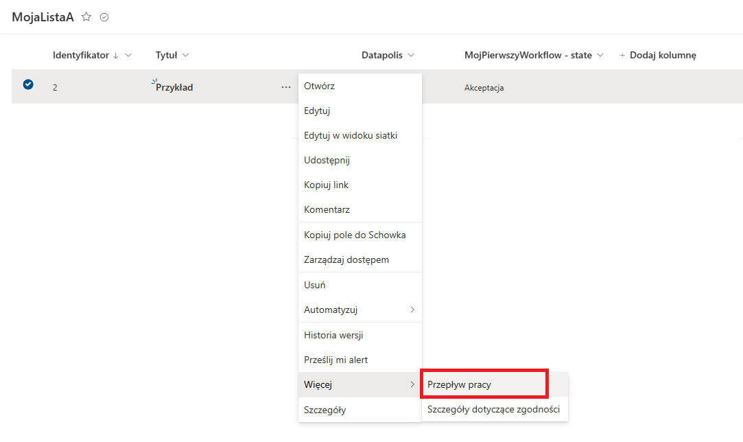 Aby uruchomić workflow ręcznie wystarczy kliknąć na kropki przy tytule elementu, a następnie z menu kontekstowego wybrać Więcej-> Przepływy pracy.