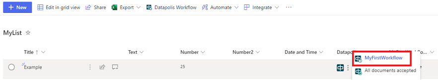 Also you can see a history of the workflow in another way. On a selected item you have to click on the dots. A menu with the name of workflow and available actions will be displayed. You have to click the name of workflow. It is shown below. A page with a workflow history preview will open.