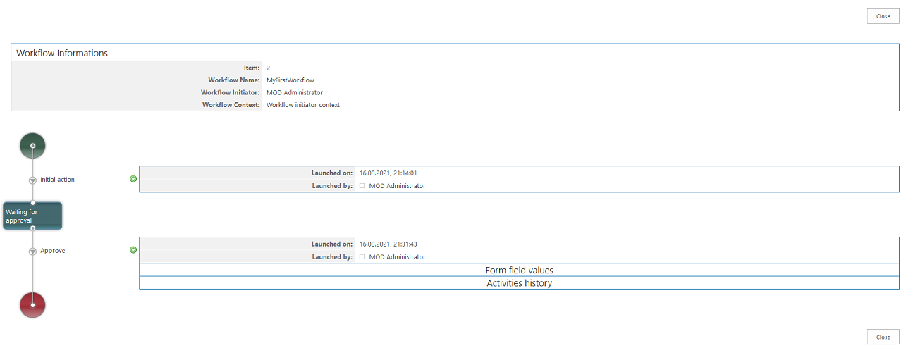 Aside from a brief view of all action and states which the workflow went through, you can also see the details of any action: what activities were launched and with what parameters, check if there were errors or warnings, what values they returned. You can also view what values were provided in action launch forms. This information allows you to monitor the process and helps detect errors during workflow development.