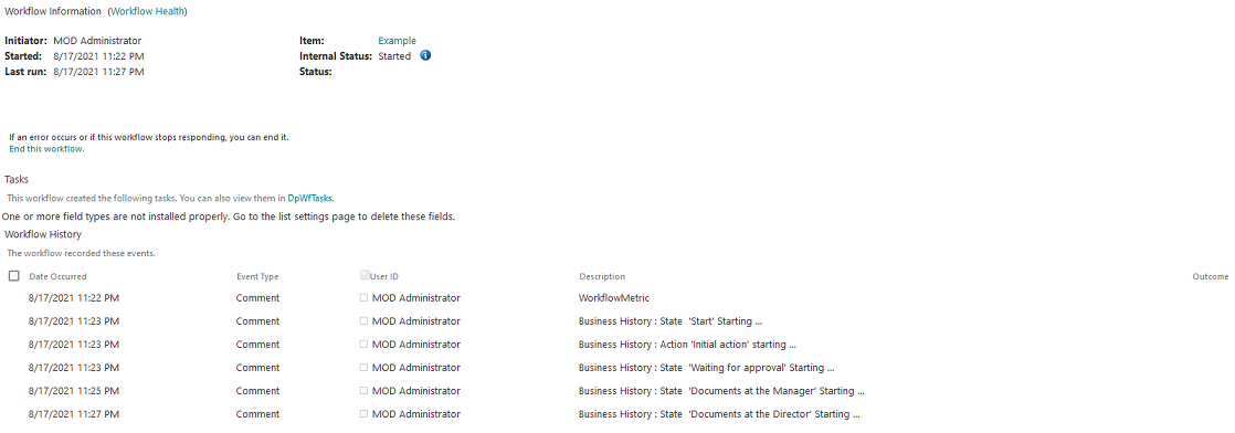 In any moment when workflow is running (and when it has ended) we can check its history. Here we will find various information about the process, how it worked, who launched which action, in which state the workflow waited most time, etc.